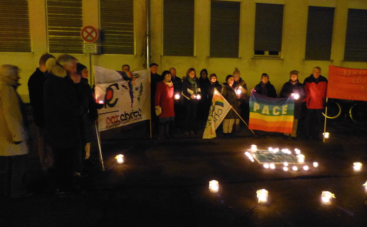 12.12.2015 | neben dem Haupteingang am Fliegerhorst ErdingPax Christi Erding-Dorfen lud zum Schweigekreis am 11.12.15Protest gegen den Beschluss des Bundestags | ![]() Lichter gegen den deutschen Militäreinsatz | |